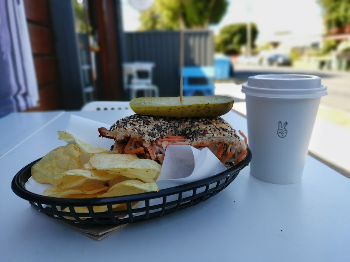 A very peaceful place to stop for a coffee and bagel. Good value for money too. The coffee is smooth and the bagels are fresh and filling. Seating is minimal and outdoor only, but on a sunny day this is a relaxing place to stop at and enjoy some great vittles.